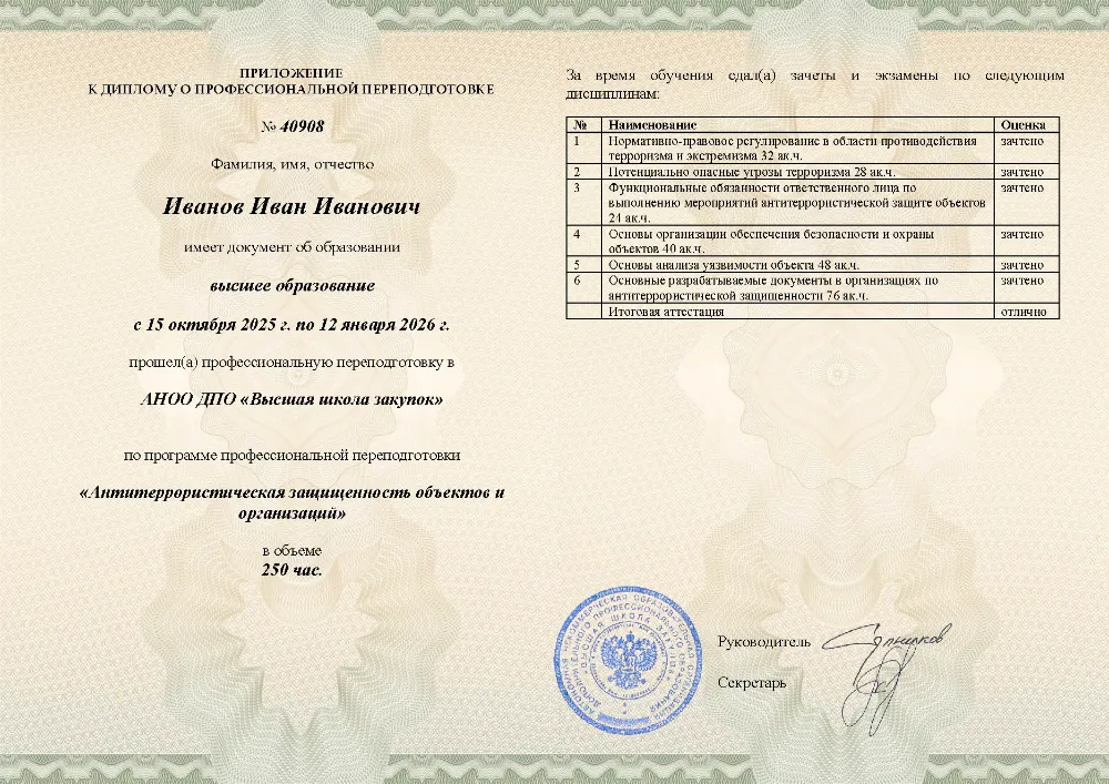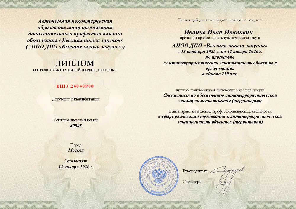 Повышение квалификации, 72 академических часа, 7 модулей: нормативно-правовые основы и угрозы в сфере образования, обязанности ответственных лиц, инженерно-техническая укрепленность объектов, анализ уязвимости, документооборот и действия персонала при ЧС. Онлайн-обучение в в Иваново с итоговой аттестацией.