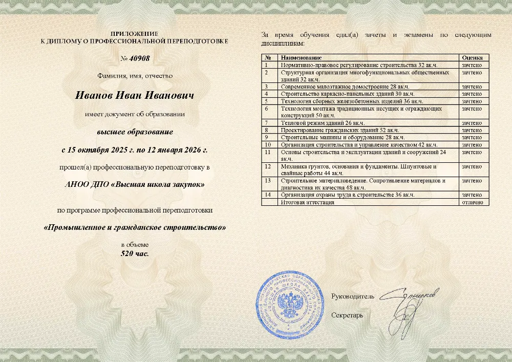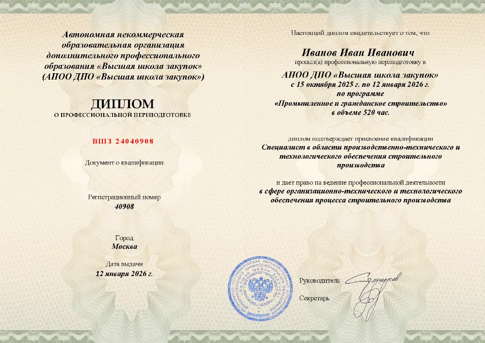 Профессиональная переподготовка, 500 академических часов, 11 модулей: изучение законодательной и нормативной базы строительства, освоение принципов строительного контроля и технического надзора, технического регулирования, применения строительных стандартов и правил, а также вопросов ценообразования, оценки сметной стоимости, управления качеством строительства, мониторинга технического состояния объектов и обеспечения техники безопасности. Онлайн-обучение в в Иваново с итоговой аттестацией.