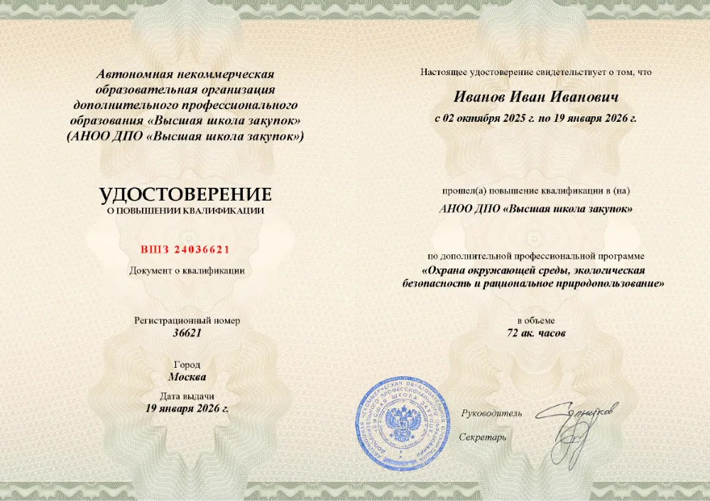 Повышение квалификации, 72 академических часа, 6 модулей: нормативно-правовые основы и государственное регулирование в сфере экологии, лицензирование деятельности, экологический надзор, ответственность за нарушения и рациональное природопользование. Онлайн-обучение в в Иваново с итоговой аттестацией.