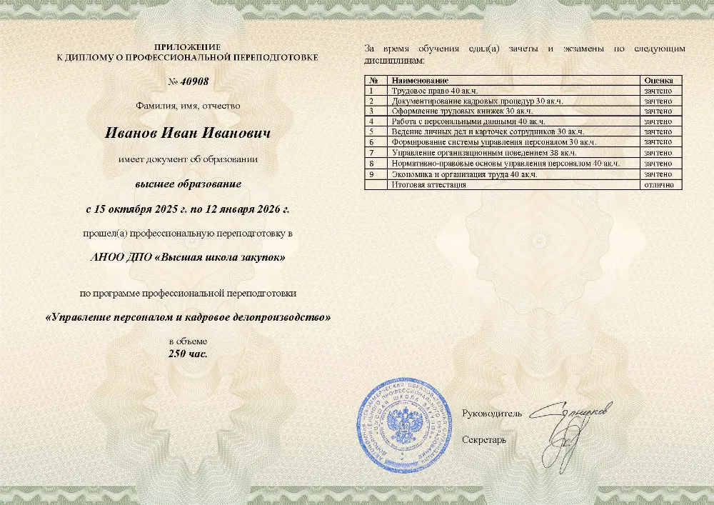 Профессиональная переподготовка, 250 академических часов, 19 модулей: трудовое законодательство и кадровое делопроизводство, подбор, мотивация и оценка персонала, психология менеджмента и разрешение конфликтов, автоматизация документооборота и работа с персональными данными. Онлайн-обучение в в Иваново с итоговой аттестацией.