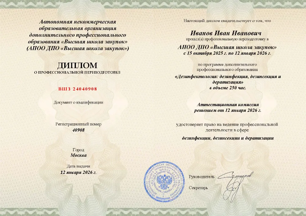 Профессиональная переподготовка на 250 часов. Изучите организацию санитарной службы, все виды обеззараживания (дезинфекция, дезинсекция, дератизация), стерилизацию и правовые нормы. Программа включает практическую работу для отработки навыков. Онлайн-обучение в в Иваново с итоговой аттестацией.