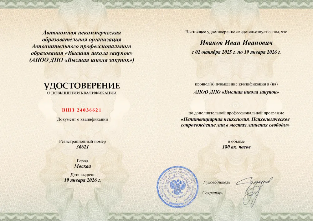 Повышение квалификации, 180 академических часов, 8 модулей: основы и структура пенитенциарной системы, социально-психологические особенности и типологии осужденных, средства исправления, работа с несовершеннолетними и деятельность психологической службы в учреждениях УИС. Онлайн-обучение в в Иваново с итоговой аттестацией.