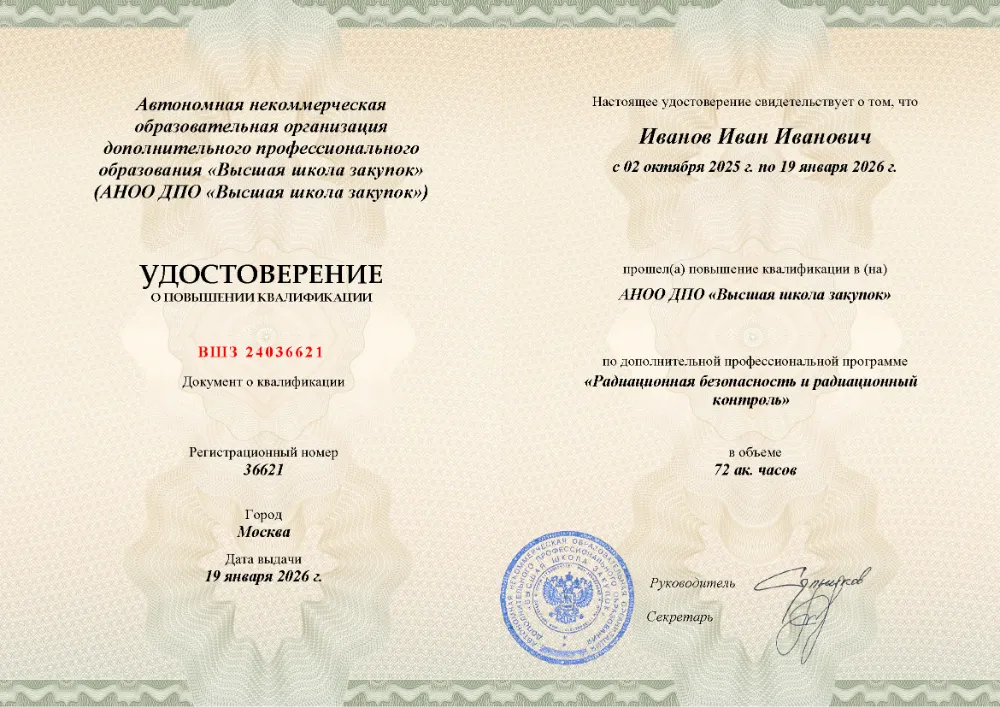 Повышение квалификации, 72 академических часа, 9 модулей: законодательное и нормативное обеспечение, дозиметрия и приборная база, лицензирование, методики радиационной защиты при эксплуатации и обслуживании установок, действия при авариях и ЧС. Онлайн-обучение в в Иваново с итоговой аттестацией.